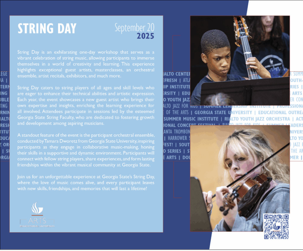 String Day will bring renowned guest artist Tracy Silverman alongside Georgia State faculty Tania Maxwell Clements, Alexis Lee, and Daniel Tancredi to present lectures, recitals, and master classes. Participants of all ages and performance levels are invited to join Georgia State University for our second annual String Day, a day of master classes, string ensembles, recitals, exhibitors, and more! Workshop participants will play in our string ensemble with our guest conductor, visit with our exhibitors, and spend a day learning techniques and developing a deeper level of musicianship for string instruments.